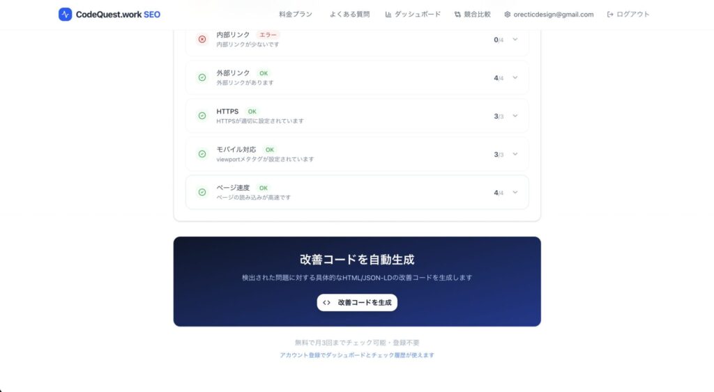 無料のSEOツールは数多く存在しますが、多くは「問題点の一覧」を表示するだけで終わります。