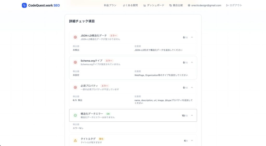 他のツールが「構造化データ: あり/なし」程度のチェックにとどまる中、本質的なSEO改善を支援します。