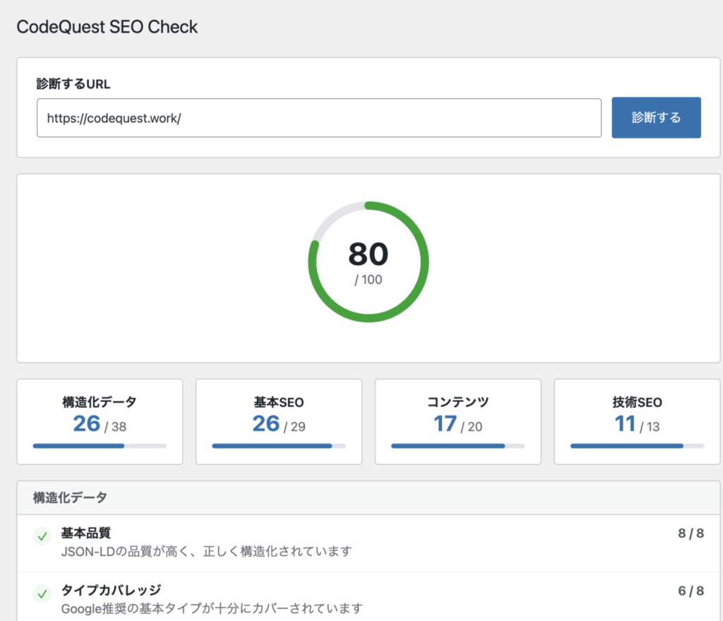 SEOスコアの詳細確認や改善コードの自動生成は、ブラウザ版のCodeQuest SEO_CHECKでお試しください。
